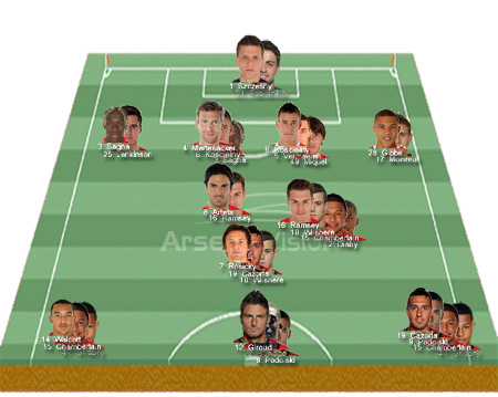 That is what I think is currently our strongest side. *cue outrage that Rambo is ahead of Wilshere* and you can see that the deepest midfielder is lacking options, especially if Ramsey is first choice as the second midfielder. Abou Diaby is also ruled out for pretty much the season
