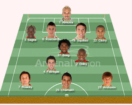 Judging by the current players missing, it looks as if Wenger has only one choice to make in his starting line up. He could go for the direct running and pace of Emmanuel Eboue, which would be the closest option to Theo Walcott or he could go with the in form Tomas Rosicky on the right of the attack. I believe that the fact that we are at home and that Rosicky’s form is very good will see our super Czech get the managers vote