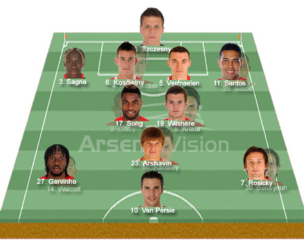 Given Arsene’s criteria for playing Arshavin in that role behind the forward I had a play around with the line up to see what a potential team could look like if for some strange reason we had a fully fit squad and Arshavin was granted his favoured role. It looks interesting with many tough choices in many positions. Would a team like that give a better balance of cutting edge and support to van Persie? Who knows.
