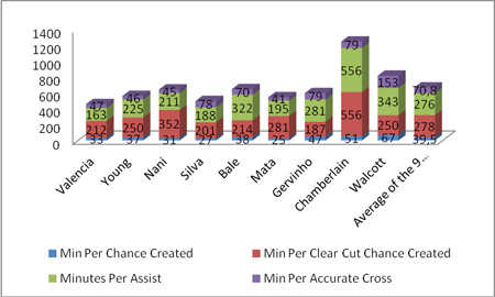 As you can see, Walcott and Chamberlain find themselves quite some way behind the pace with minute totals above the average of the nine in all four categories. Walcott creates a chance only once every 67 minutes, more than double the time it takes Antonio Valencia, Nani or Silva to do likewise. It’s a similar story with minutes per assist, and I’m afraid Theo favours even worse even when it comes to minutes per accurate cross: taking more than 3 times the time to produce an accurate cross than any of his United counterparts.