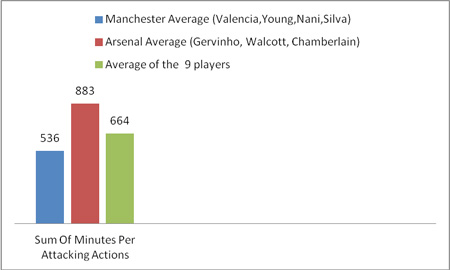 In the below chart we can see the sum of Arsenal’s attacking actions per minute (in red) compared with the average of the nine players (in green), and those of the 4 selected Manchester players in blue.