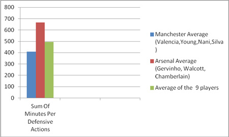 The bad news for Arséne Wenger, and perhaps more so for the full-backs at the club, is that again only Gervinho’s performance can be seen to be better than the average level of the nine players. He beats Young and Mata too to take fifth best overall defensive performance of the nine players, helped by better than average scores at minutes per interception, and minutes per possession won in the defensive and attacking thirds.