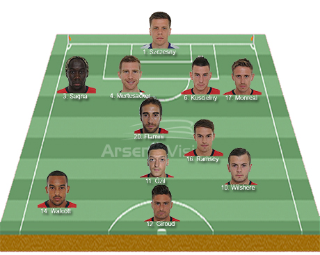 Rumours are that Sagna, Monreal and Walcott will all start. You would imagine that both Ramsey and Wilshere who were rested in Italy will start also but then it is a question of who misses out. Given the minutes played you would say that Özil is prime target to sit out but I cannot imagine Arsene resting Özil for such an important game. If Walcott starts then Santi Cazorla will probably make way. Jack Wilshere can fill in the role of creative wide player with added tenacity which will be needed, especially if Navas plays on that right side for City.