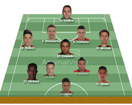 Subs: Szczesny, Gabriel, Gibbs, Chambers, Flamini, Ramsey, Walcott