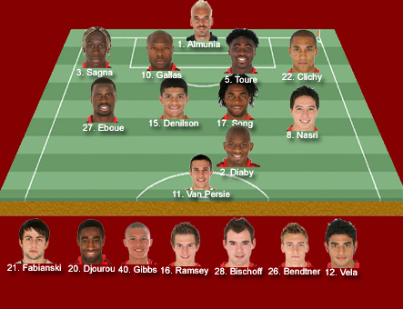 It is a shame that Arshavin cannot play because his cutting edge was very refreshing on the weekend, he will only get better in time. Emmanuel Eboue is likely to start on the right in place of the Russian.