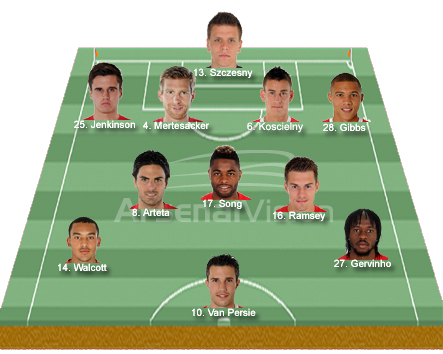 Our front three should remain the same. You get the feeling that they are still trying to adjust and adapt together. Gervinho has plenty of ability but as yet to find consistency, his link up play with his team mates has blown hot and cold. I suspect that our attack will improve as the understanding and link up play matures and improves. I feel as if Gervinho needs a goal and a good performance, he looks very much a confidence player so the quicker he feels settled and confident the better for our end product in the final third.