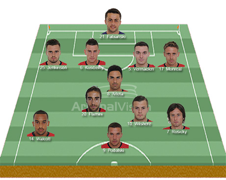 To be honest I have no idea what the manager is thinking. Serge Gnabry could start because he has not had many minutes in recent weeks so Theo Walcott may not even start. Will Arsene want to start Flamini and Arteta together again? I am not sure. Arsene also suggested that it was unlikely that Özil would feature but given that he trained he could well be bluffing. Perhaps he will start on the bench.