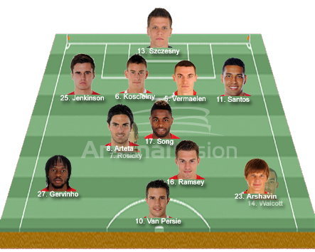 I would say that Theo Walcott could well be in line for a rest given that he has started all the last few matches as well as playing for his country. If Arsene does decided to rotate Theo then Arshavin could come in on the left and Gervinho move over to the right.