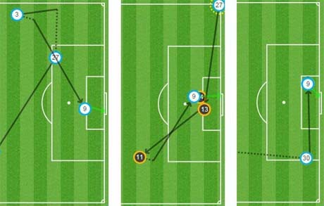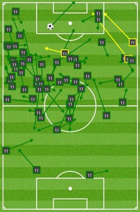 Interchanging with almost everyone, Ozil allowed build up to be made from elsewhere on the pitch not just from the middle and provided an opportunity for others to go where the space is. El Neny and probably the rest of our team’s first thought with the ball is where is Ozil and if he’s on the left wing, that’s where the ball’s going. It created an air of confusion as to who was playing where, who was meant to be marking who and subsequently allowed our 3 behind the front man to have a field day. Numerous time we created situations in which we had a man free in the halfspace, in fact all 3 of our goals came from the position. Ozil and Alexis got on the scoresheet from almost exactly the same blade of grass and for the equaliser Ozil delivered a ball from there to Welbeck who should have finished, fortunately his first touch landed to Koscielny who managed to do just that.